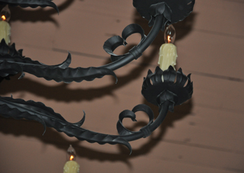 Three chandeliers decorated with classic water leaves. One old chandelier with eight arms was already there, one copy to be made, and another larger one with 15 candles in two tiers to be designed. All leaves are cut from steel sheet and hand hammered. The candles are made from real bees wax.
