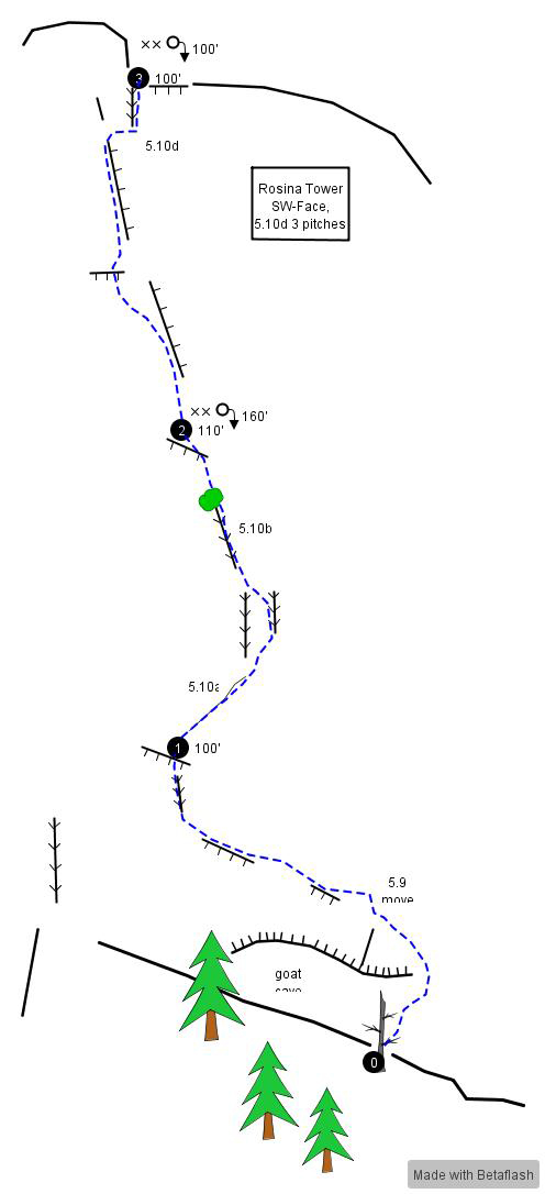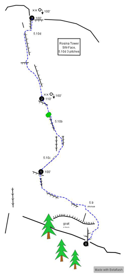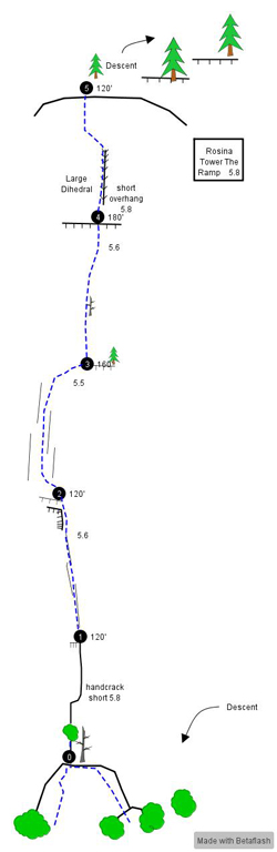 Rosina Tower (aka The 4th Sister)The Ramp, 5.8, 5 pitchesRosina's Other Side, 5.10d, 3 pitchesRosina Tower is mostly known for The Ramp, an East Rosebud Classic. The Ramp offers excellent moderate crack and face climbing on solid gneiss. Difficult sections are short. Most of the climb is easier than the difficulties indicated per pitch. Enjoy a sunny day with nice views of East Rosebud Lake and the Beartooth Mountains. Rosina's Other Side tells a different story: Steep cracks with a dicey traverse at the very top. Maps:USGS 7.5 min series Alpine Quadrangle Approach:From Red Lodge or Columbus take Highway 78 to Roscoe. Follow East Rosebud Road south. After about 10miles you enter Custer National Forest. Continue on to where the road crosses East Rosebud Creek and turns to gravel again. Park at 2 turnout to the left after crossing the bridge. end of road. The Ramp is visible right above on the west side. Scramble up the glacier polished rock apron and continue on to the bottom of the cliff in about 45 min. The climb starts on top of a little rock outcop at a broken snag. For the Other Side move around to the cliffs SW side and scramble up the gully until you are directly under the headwall. The climb starts on the right side of a goat cave at a dead tree. Route Descriptions:The Ramp: Climb up a crack right above the snag. Pass by a bush to reach the crux hand crag. It was rated 5.7 originally. 5.8 seemed more appropriate to me. In any case, the difficult section is just a few feet. If you are scared of this section you can climb up cracks and slabs to the right of the original route and move back above the crux (5.6 if you find the weaknesses right). The route continues up the crack until you reach a small ledge 120 feet from the start. Pitch 2 follows the crack system onto a large pedestal like ledge to the left (120 ft, 5.6). Face climb the left side of the leaning wall and move to the right on top to reach another ledge with a small conifer (160 ft, 5.5). From here straight up, past a dead tree to the ledge under the big overhanging dihedral (180 ft, 5.6). For the final pitch go straight up the dihedral to the top of the cliff (120 ft).The first moves into it are the second crux of the climb. Actually it is just one hard move. Call it 5.7 or 5.8. Rosina's Other Side: Go up at the right side of a cave behind a dead tree until ledges allow you to traverse left and up (short 5.9, then easy) about 50 feet. An easy crack leads up to a comfortable belay ledge. From here follow a flake up and right (5.10a) to gain the beginning of a finger/hand crack. Follow this crack up to a belay ledge with ring anchors (5.10b). It is easier to move over to the right for the first section of the crack and then back. The third pitch follows the crack further, then moves into the left wall to another ledge. From here continue up the crack until it ends and traverse right into the final dihedral (5.10d) that leads to anchors on top of the cliff. Descent:From the top you can climb/scramble down to the right (north). Go to the right and up a little further until you reach the upper part of the gully between Rosina and the next rock outcrop to the north. Traverse on and scramble down that outcrop. about half way down you can traverse back into the gully and down it to the bottom of Rosina Tower. This descent involves lower 5th class climbing or one or two short rappels. If you have double ropes you can rappel the SW-Face (Rosina's Other Side) into the gully on the south side of the cliff. First Ascent:The Ramp: Unknown Rosina's Other Side: Frank Annighofer, Annette Lavalette, August 2011