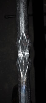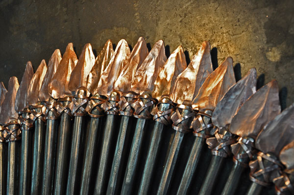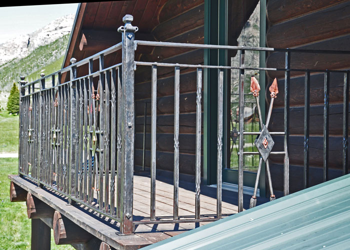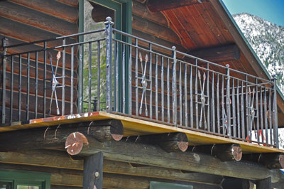 Crossed arrows with Copper tips give a special touch to this balcony railing. Every second picket features pinapple twists. The diamond shaped twist theme is carried on in a diamond shape of the twist positions and in a diamond shaped shield covering the crossing arrows.