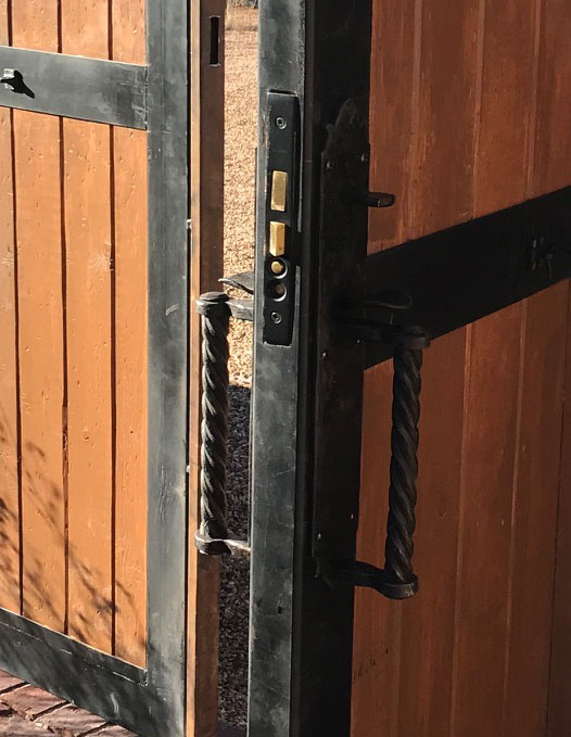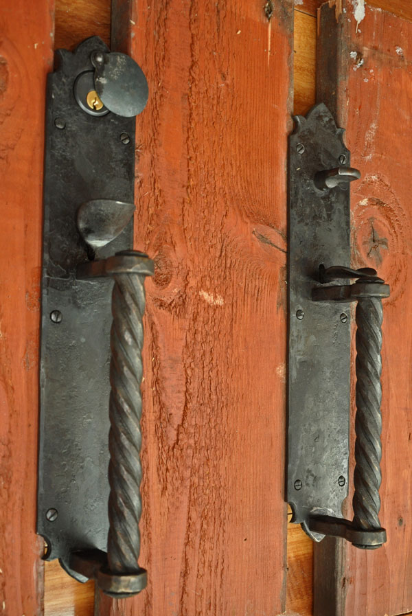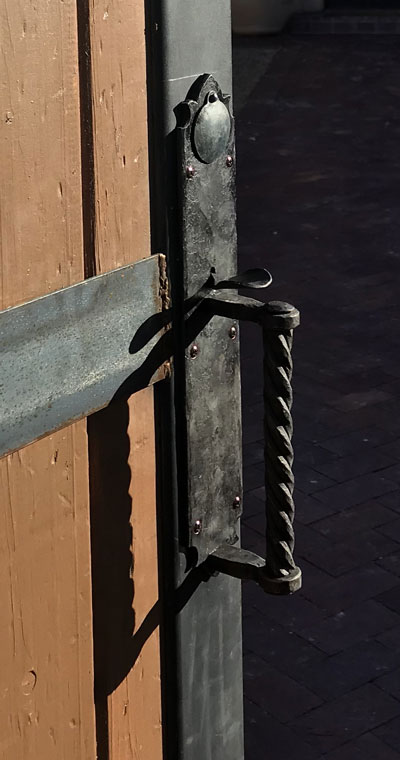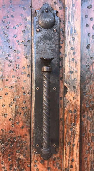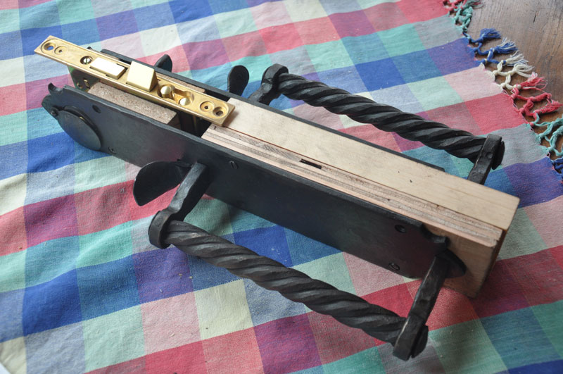 Handforged replica of antique New Mexico double thumb latch set, fully functional with Baldwin mortise lock. First picture shows the original
